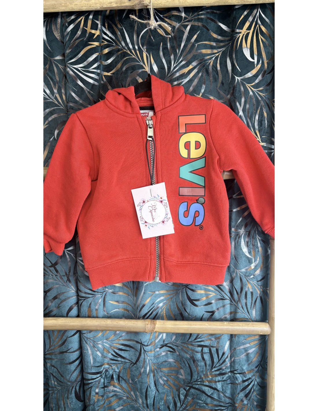 • Vêtements : Veste rouge Levi’s avec capuche et fermeture éclair, en très bon état.