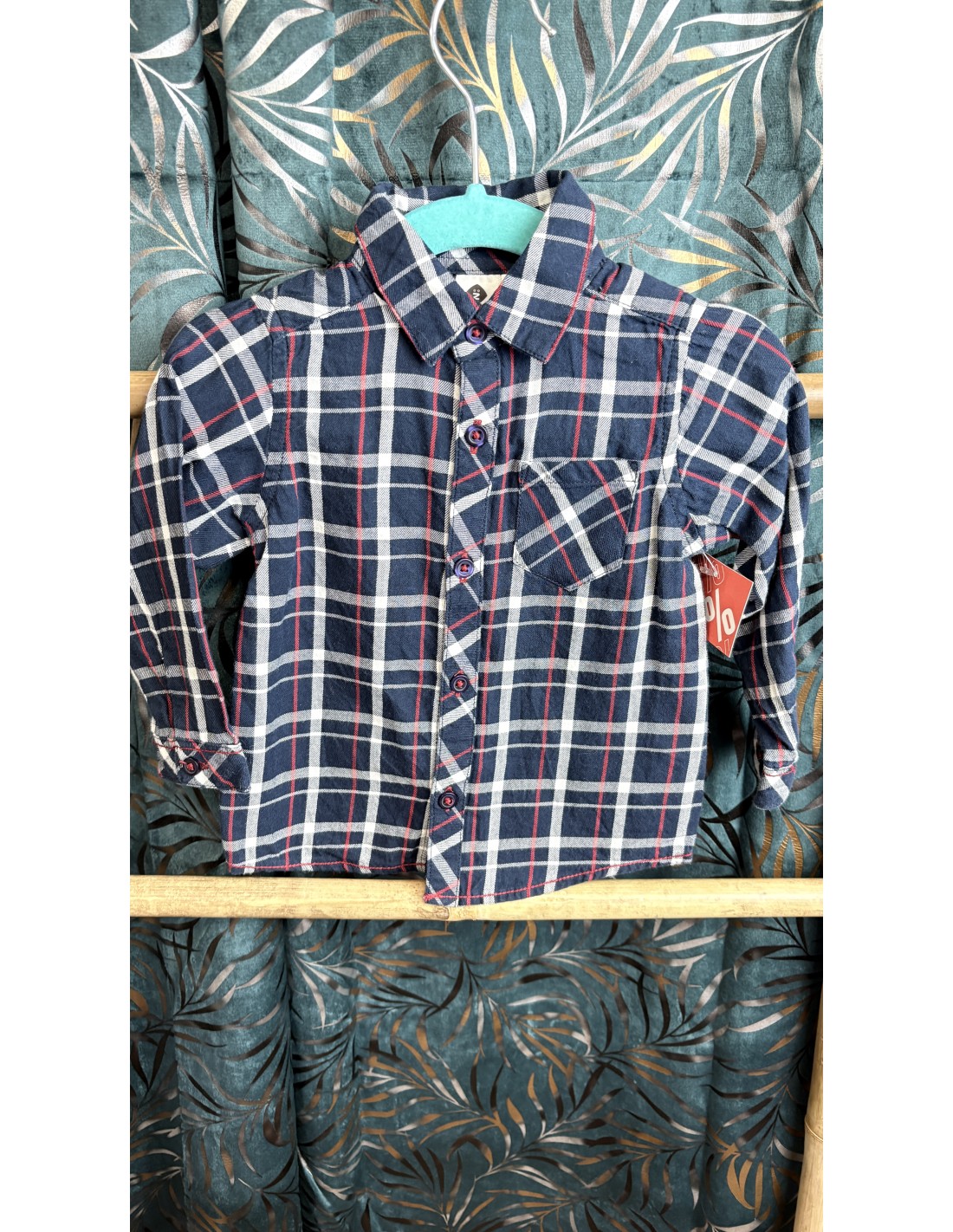 ‱ Produit : Chemisier à carreaux bleu avec fermeture à boutons.