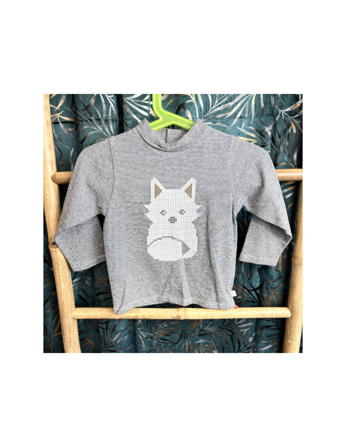 • Description du produit : Pull léger petit col roullé gris avec motif renard, manches longues.